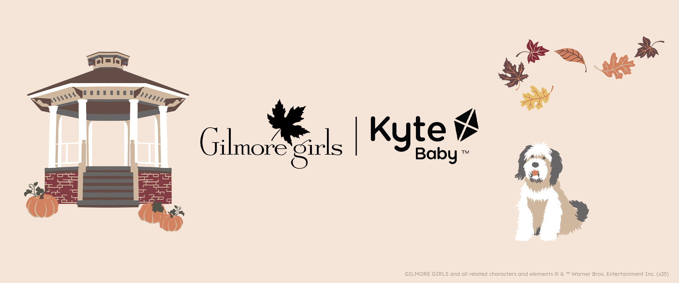 Smiling infant wearing the Bib in Gilmore Girls and Cloud Knotted Bow with a Latte zippered romper Beige bandana bib with 'Gilmore Girls'-themed designs on a white background