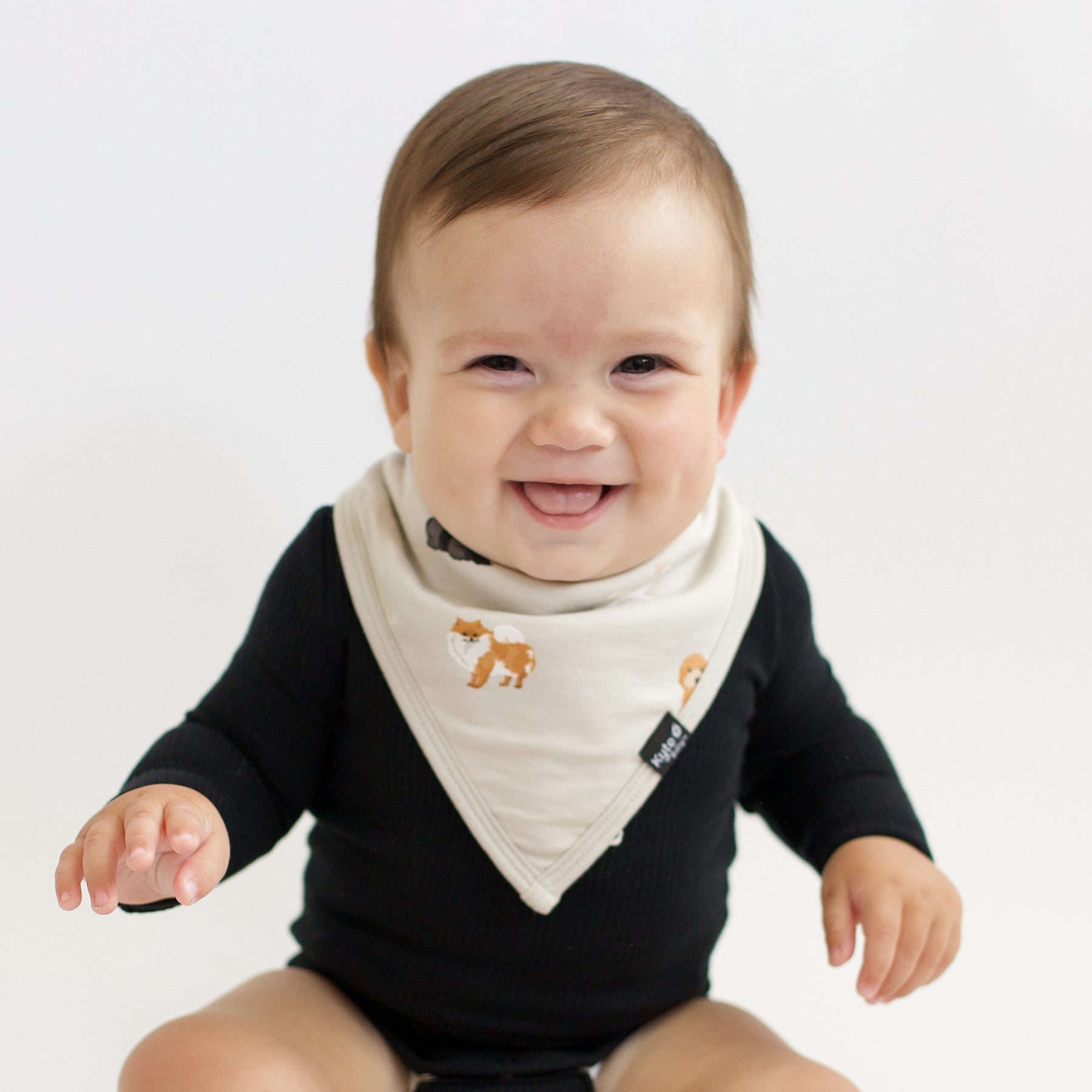 Baby wearing Bib in Fluffy Dog and Midnight Long Sleeve Bodysuit next to real dog