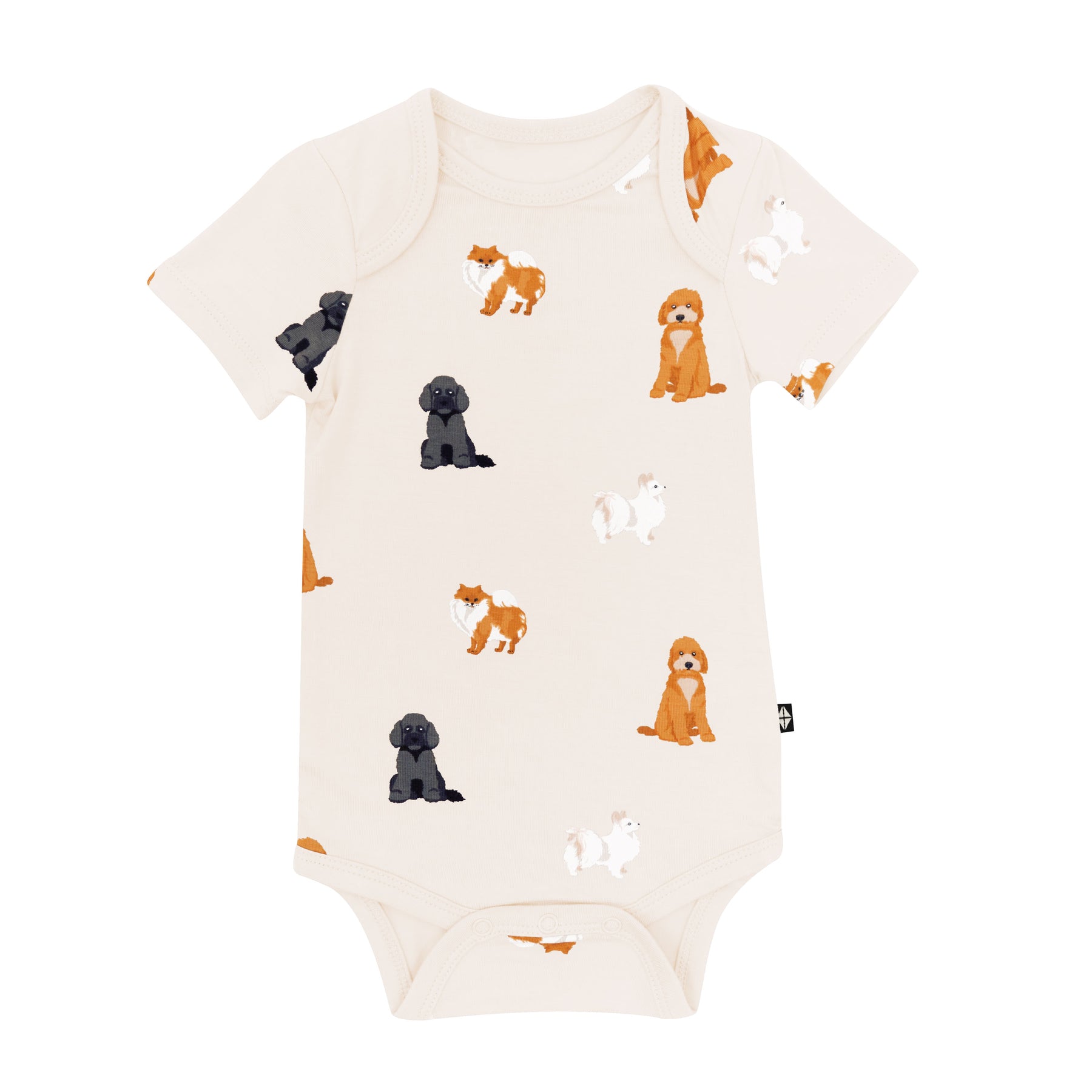 Baby wearing Bodysuit in Fluffy Dog next to a real dog
