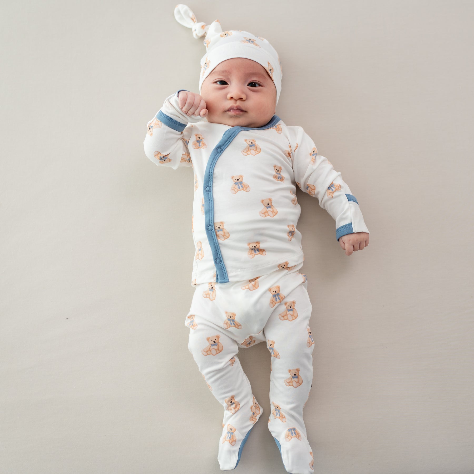 Welcome your newborn with the perfect outfit to mark the occasion. This ultra-soft set features a kimono style top that’s gentle and non-irritating on your baby’s umbilical cord stump, footed pants to cover those tiny toes, and a stretchy cap to keep their head warm.