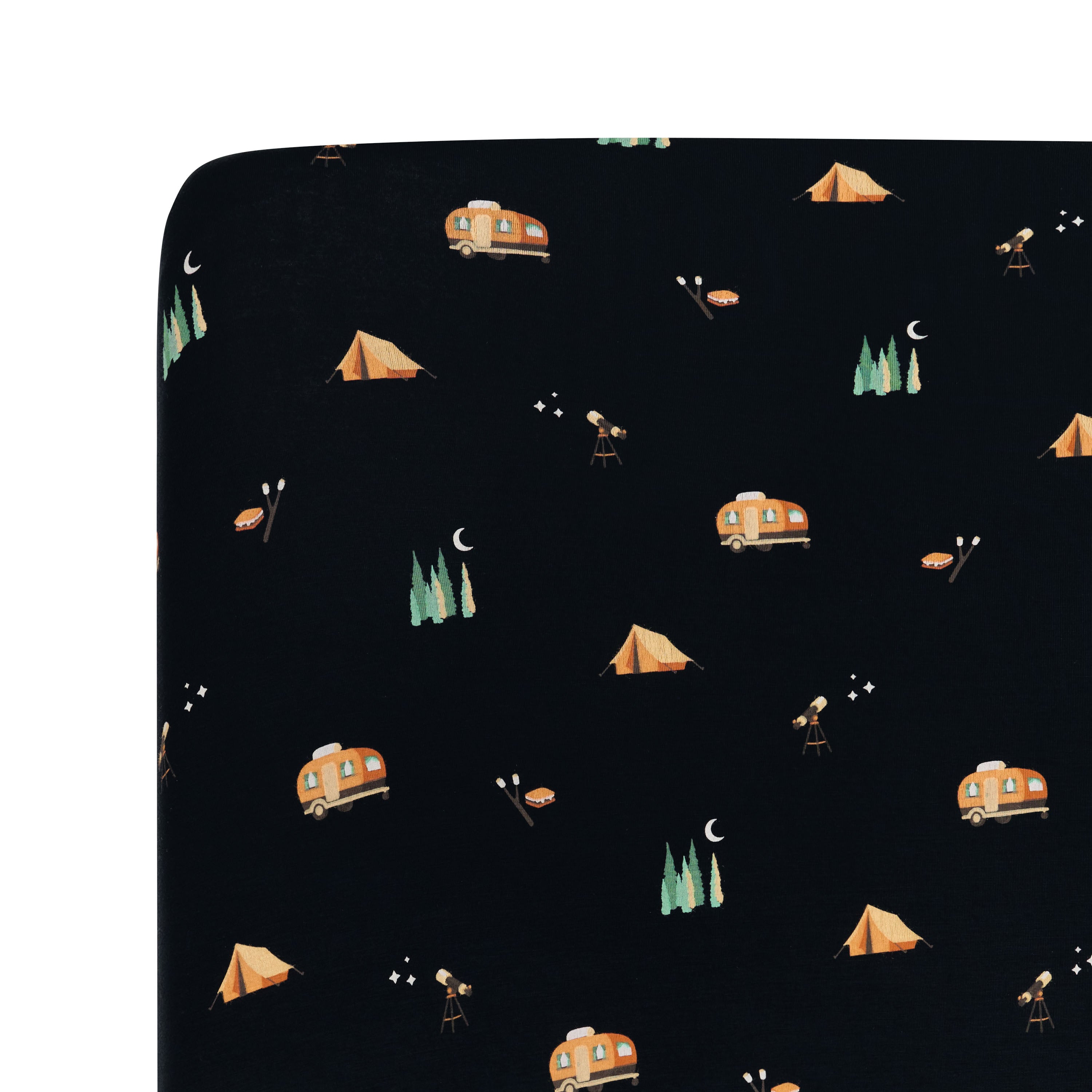 Adventure awaits when you dress in national park shirts from our National Park Foundation x Kyte Baby collaboration. Celebrate the joys of the great American road trip with national park clothes that support America’s best idea. Our Road Trip print features an adventure-ready SUV traveling between popular American landmarks, including the Delicate Arch, Old Faithful, mountains, and pine trees. Take a break from your travels with our Under the Stars print that celebrates the glories of a good campout with a vintage RV, stick with toasted marshmallows, and a crescent moon over a grove of pines.