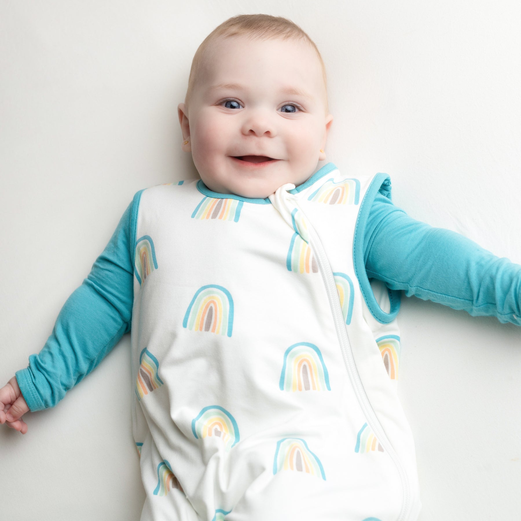 An all-over print of boho style rainbows, with the outermost arc colored in a dark aqua blue called Makai, followed by a pale turquoise called Mint, then a pale yellow, then a light apricot, and finished with an inner core colored in taupe.