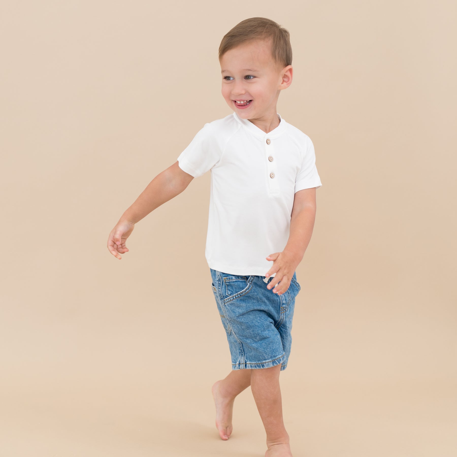 Toddler smiling in Short Sleeve Toddler Henley Tee in Cloud