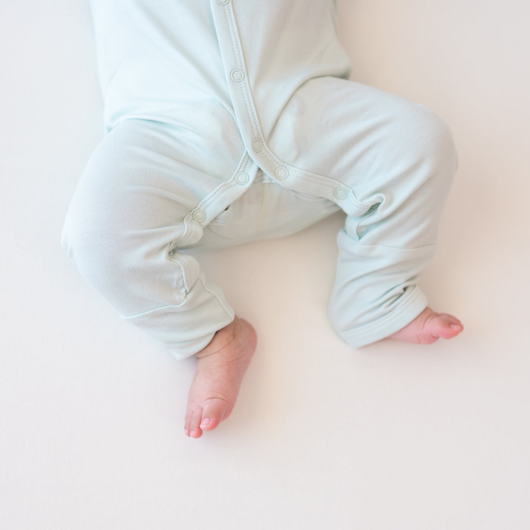 Close up of Romper in Dew snap closures on the legs while being worn on a baby