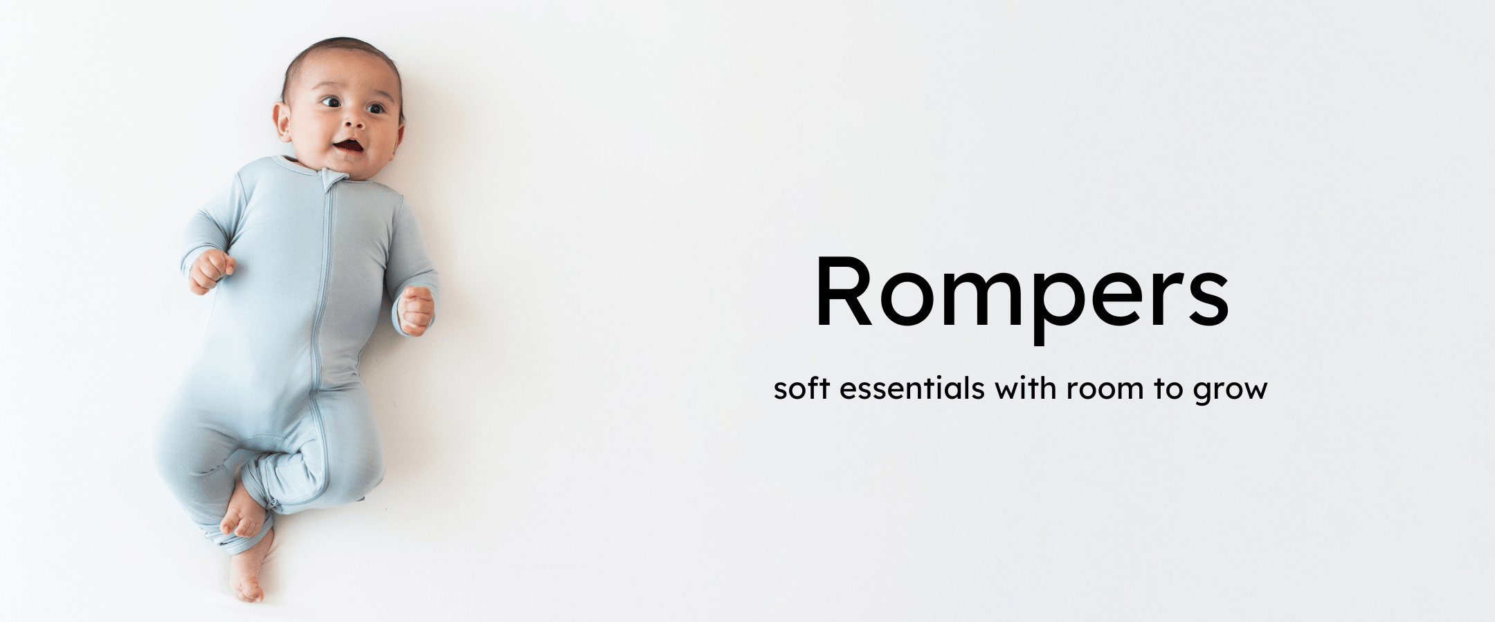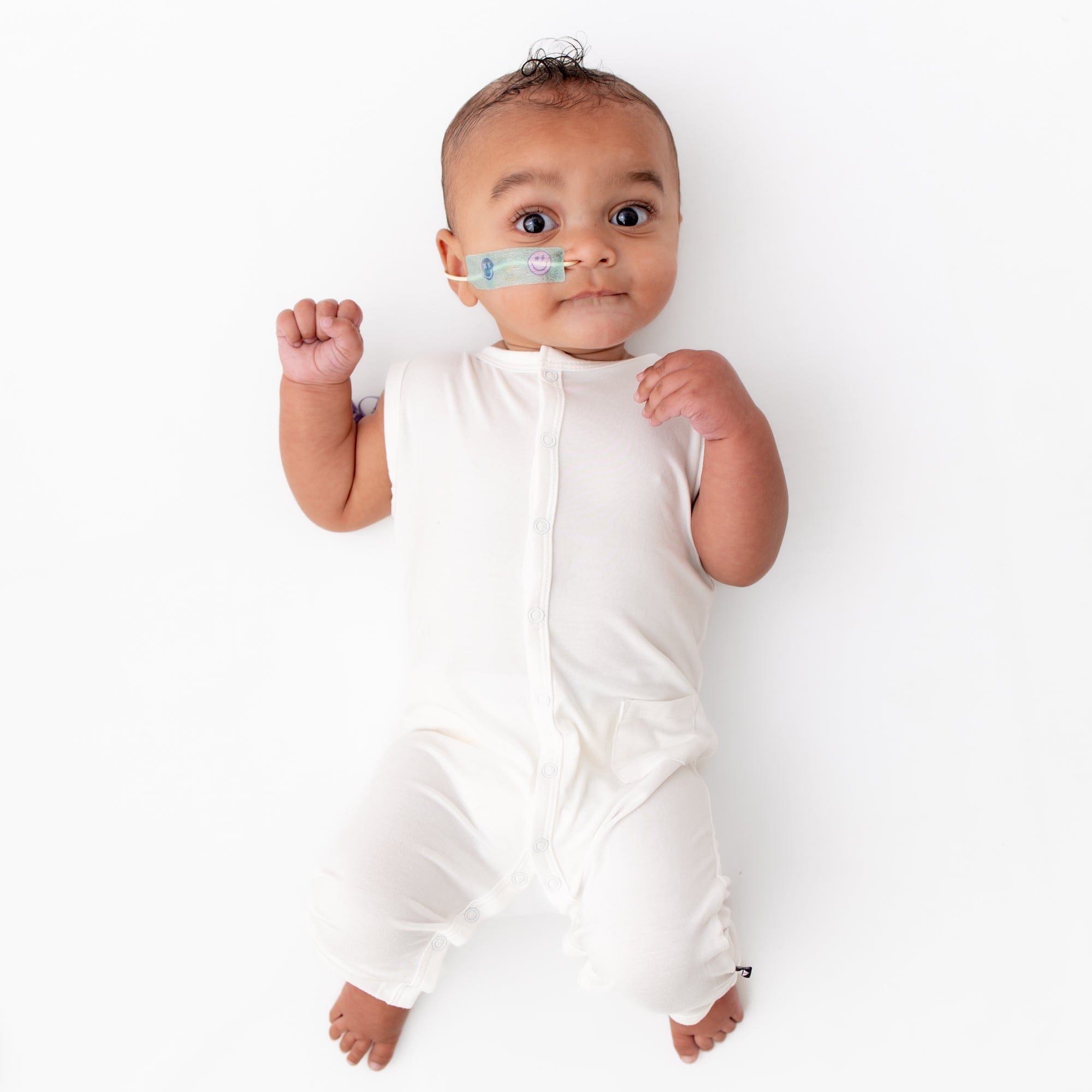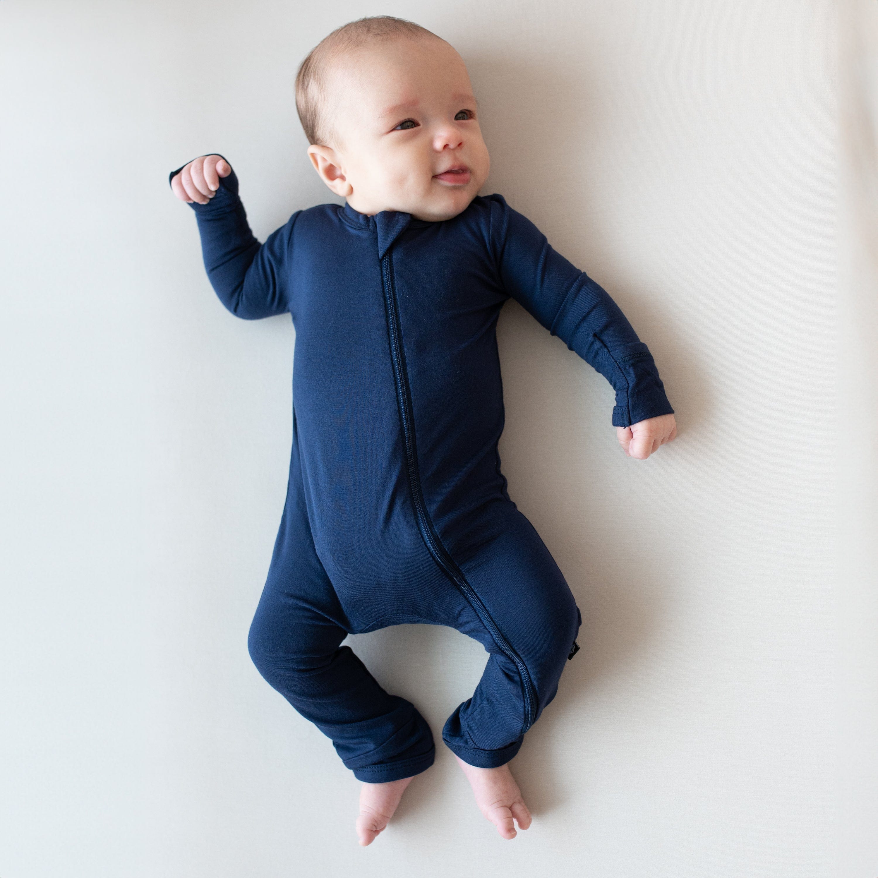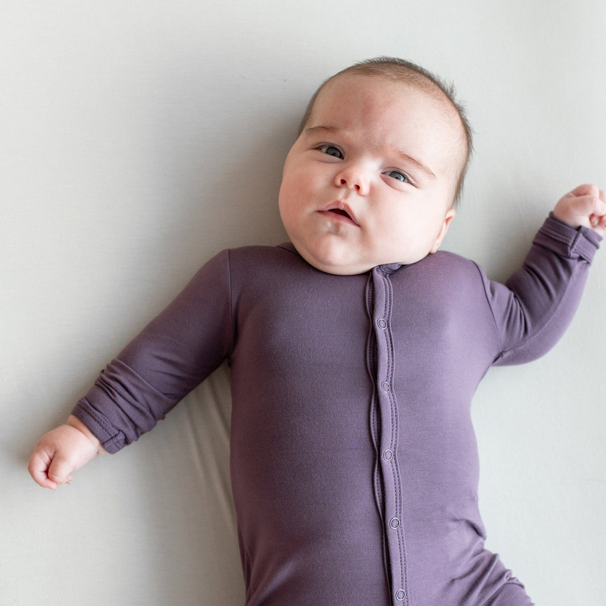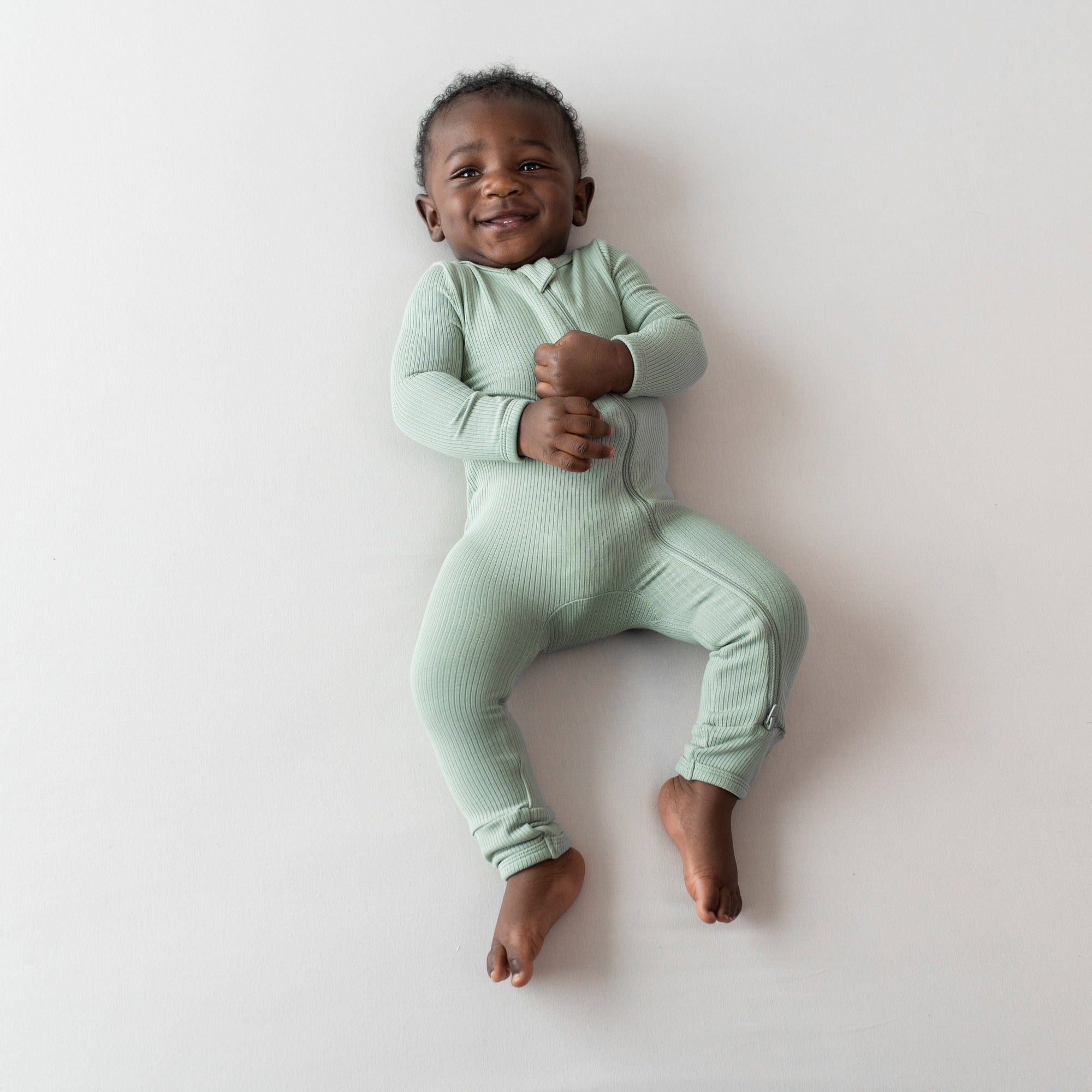 Baby laying on white surface while wearing Kyte Baby  Romper in Sage