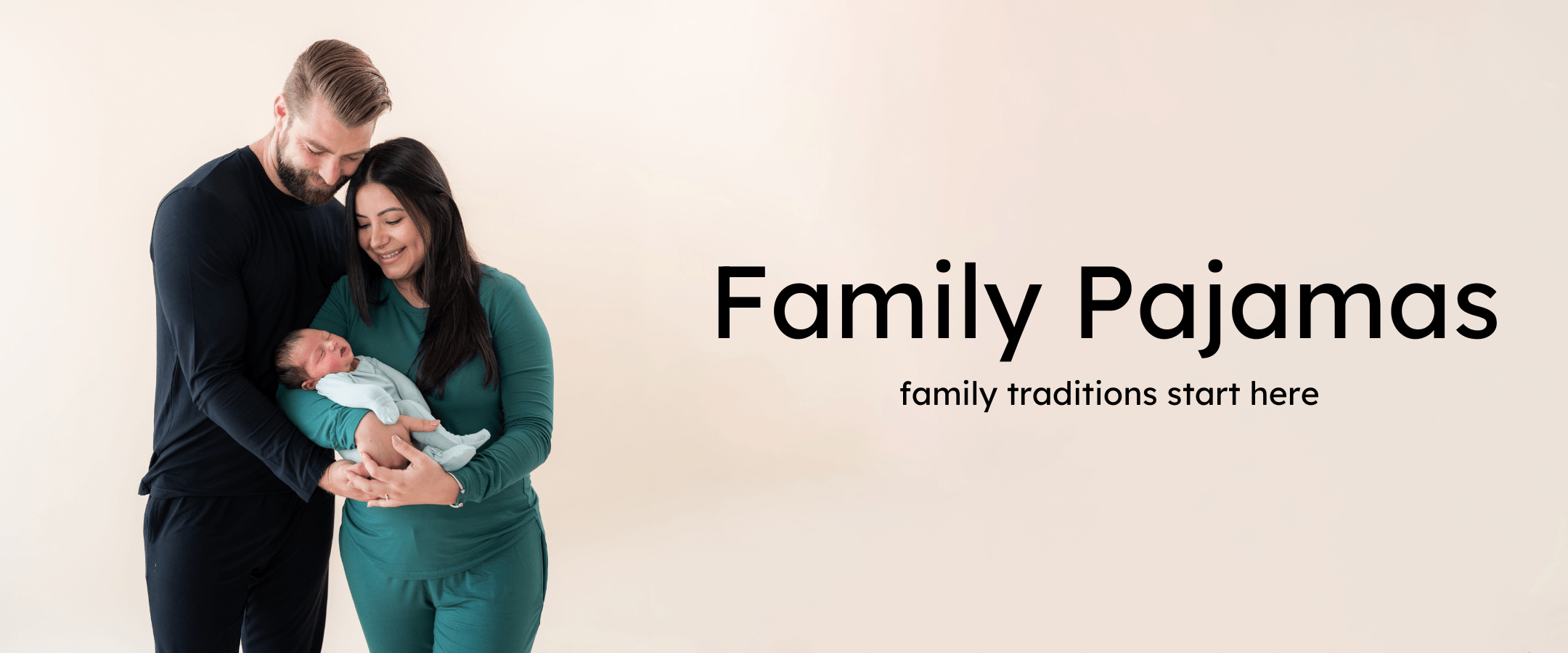 Female model posing wearing the Women's Jogger Pajama Set in Classic Cowboy in front of a light neutral backdrop Family of three wearing matching Classic Cowboy pajamas and brown cowboy boots