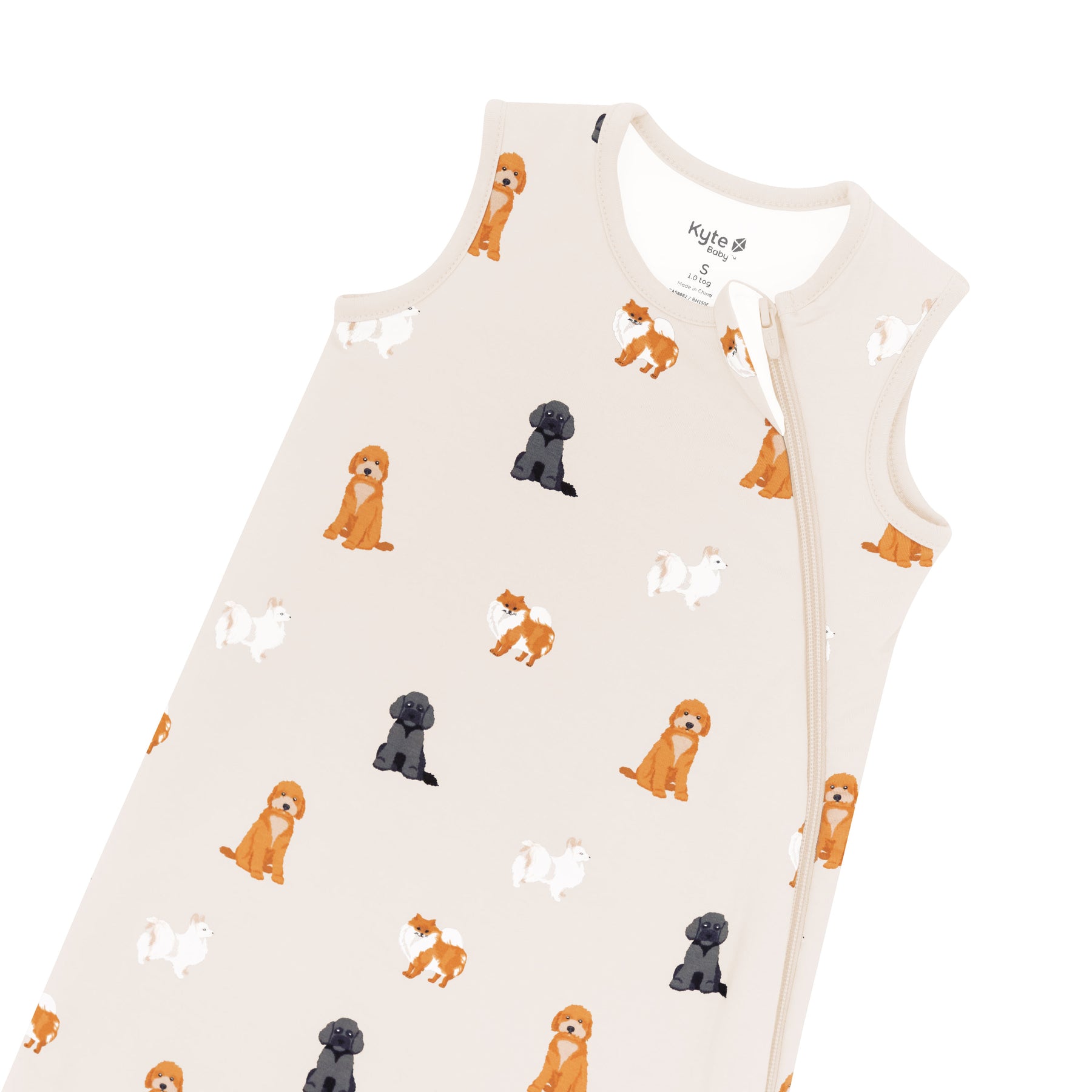 Flat lay photo of Kyte Baby Sleep Bag in Fluffy Dog 1.0