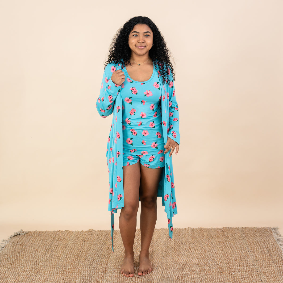 Pregnant mom wearing Women’s Short Sleeve Pajama Set in Hibiscus with a real hibiscus in hair