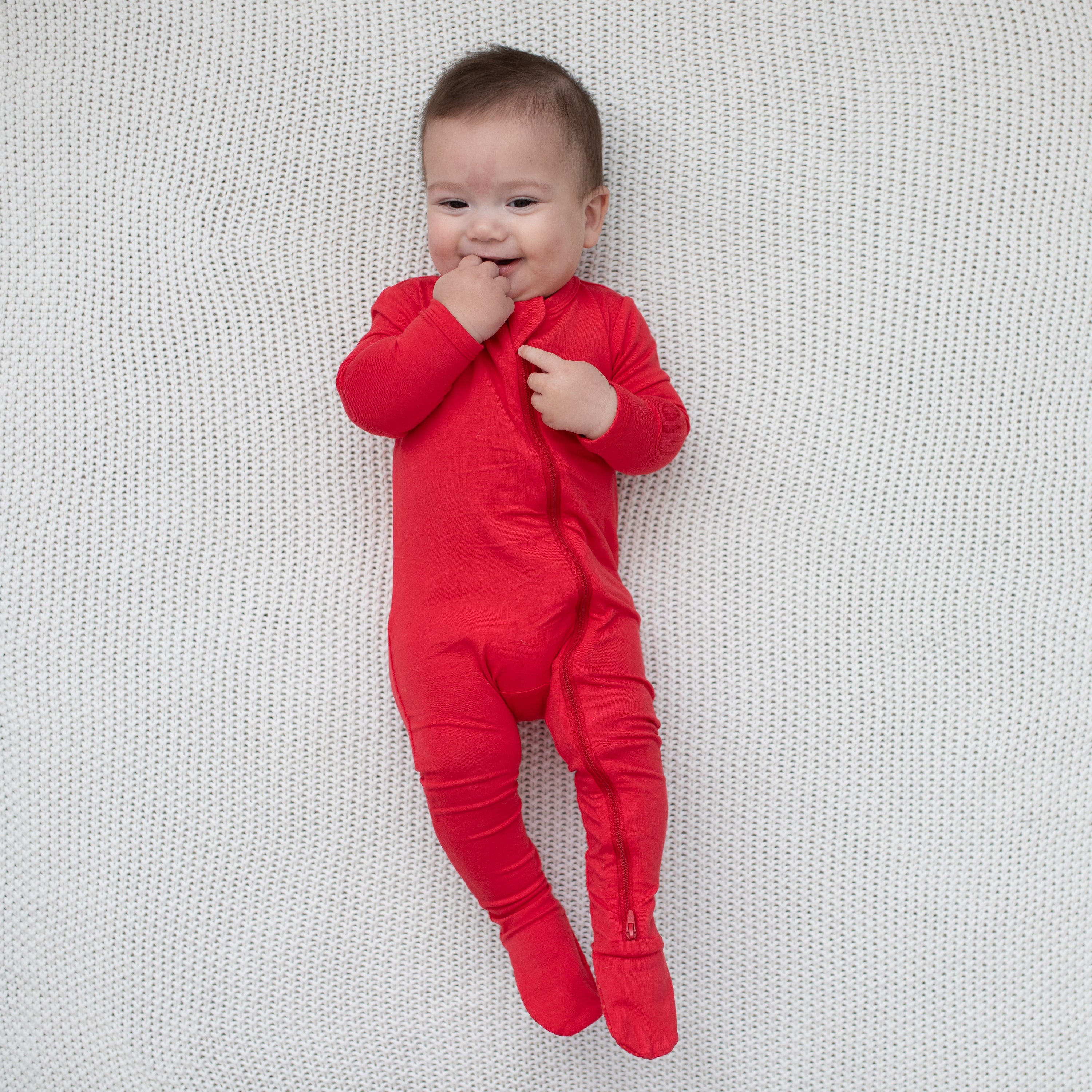 Baby modeling Zippered Footie in Cardinal laying on a knit blanket